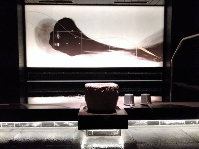 墨絵アートがスクリーンに映し出されるような、シアターを思わせる真っ暗な空間。到底お風呂からは想像できないようなドラマチックな大浴場が広がります。