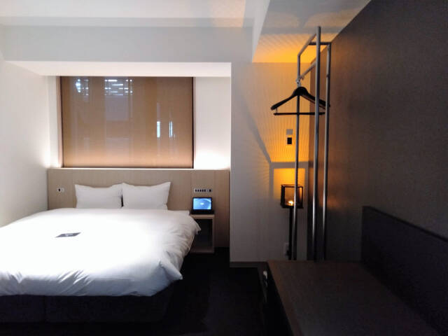 宿泊したのはクイーンルーム。広さは約19平方メートル。箱型のクローゼットなどは設けられず、シンク・デスク・収納などが壁面にコンパクトに集約され、空間をうまく使ったレイアウトで広さ以上のスペースを感じます。テレビもポータブルテレビのみ。