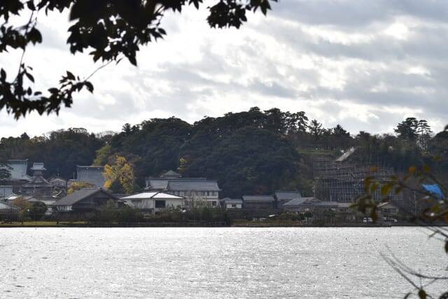 蓮如も眺めた、吉崎御坊から見える鹿島の森。現代はこのベンチがお腰掛けの石か