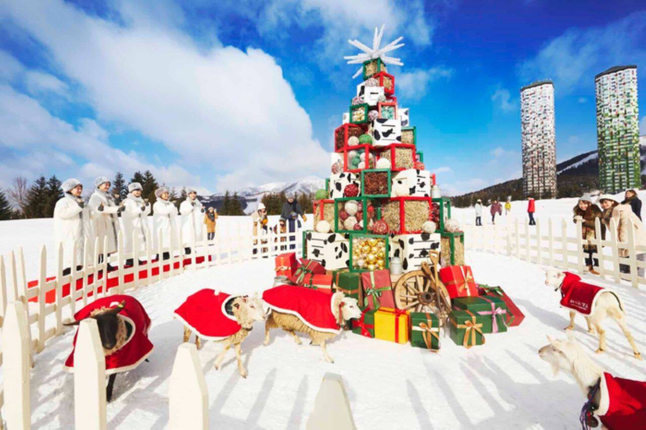 牧草を詰めたキューブや牛柄の木箱で作った、高さ5メートルの「牧草ツリー」の周りに、サンタの衣装を着たヤギやヒツジがのんびりと過ごしています。その様子がのどかで、牧場の雰囲気を感じられます。また、動物がベルを着けて演奏に参加する「ファームクリスマスコンサート」を実施。可愛らしい動物の姿を見ることができます。