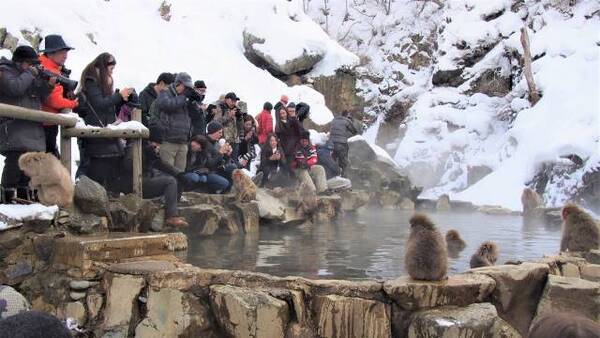 海外ではスノーモンキーとして知られる地獄谷のニホンザル。たしかに温泉に入って温かそうなニホンザルは、ほっとする光景で愉快な気分になるんですが、世界中の人々にこんなに注目されるのも不思議な気分です。大きな歓声を上げる外国人たちを見ているのも面白かったですよ。