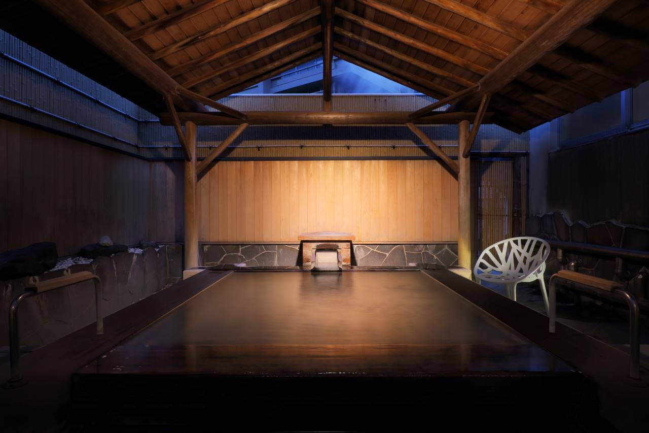 屋号「源蔵の湯」にあやかった男性用の浴室は、御影石造りの大きなお風呂で、実際には、浴室は湯気がもうもうとたちこめて気持ちのよいお湯です。また露天風呂はヒノキ造りの湯舟なんです。