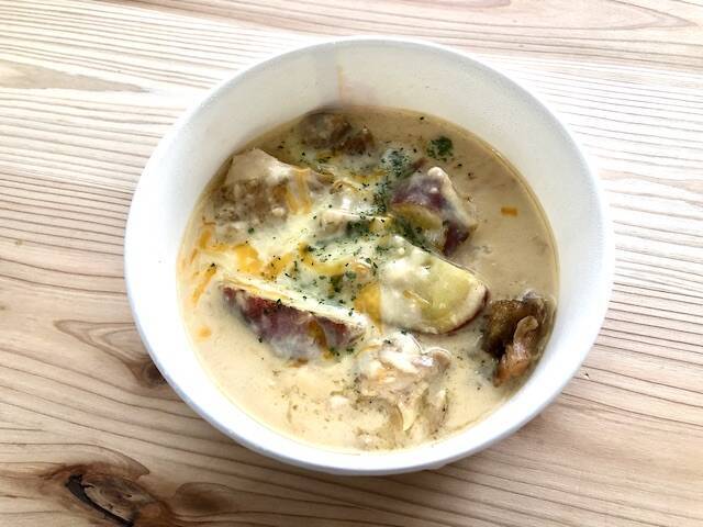 が!私は勝手に思うのです。じゃがいもが入っていたら「クリームシチューにニンニクを大量に入れたヤツ」という印象になりかねないと。さつまいもという変化球によって、クリームシチューを連想させることはない、れっきとした他国の郷土料理という趣を濃くさせたのではないかと・・・。