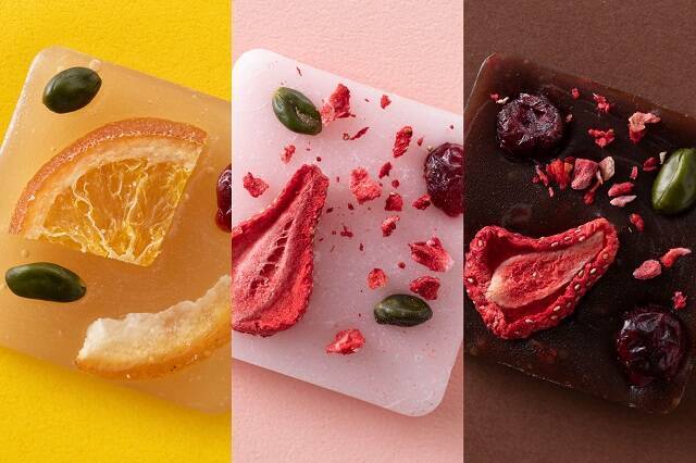 タブレットのように薄く作った羊羹と、素材の美味しさを閉じ込めた色とりどりのドライフルーツやナッツを、和菓子職人の丁寧な手仕事で織りかさねて、新しい羊羹のスイーツ「果の彩」が誕生しました!なめらかで優しい羊羹の甘みと、果実の香りと食感が綾をなす、3種の味わいがひと箱に。それぞれに違った味わいをお楽しみください。