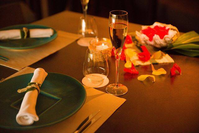 星のや竹富島では、「大人のいりばなデート」を今年も実施!いりばなとは、竹富島の方言で「日没時」のこと。琉球の伝統的な木造船「サバニ」の上から、夕焼けの空と赤く染まる海に包まれるように、海に沈んでゆく夕日を眺めることができます。その後はダイニングでディナーを楽しみ、ふたりの時間を満喫してください。
