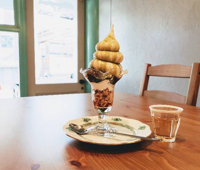 看板にあった「ヴィーガンパフェ」は、大きなソフトクリームが特徴的。人気の「黒みつ焦がしきな粉」、あずきも入った「濃厚チョコレート」、男性に人気の「クレメダンジュとミックスベリー」、京都らしい「抹茶ティラミス」、シナモンやカルダモンにジンジャーシロップがきいた「スパイス」、「季節のフルーツ」の全6種類(各1,200円・税込)。ココナツも不使用で、あずきや豆乳チーズ、コーヒーの果肉を乾燥させたカスカラが原料のシロップをかけて、動物性素材にはない優しい甘みのパフェに仕上げてあります。