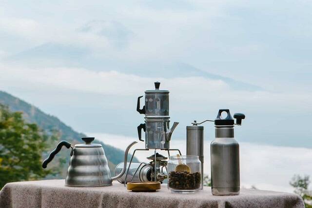 山頂では、自身で豆を挽き、お湯を沸かして珈琲を淹れます。