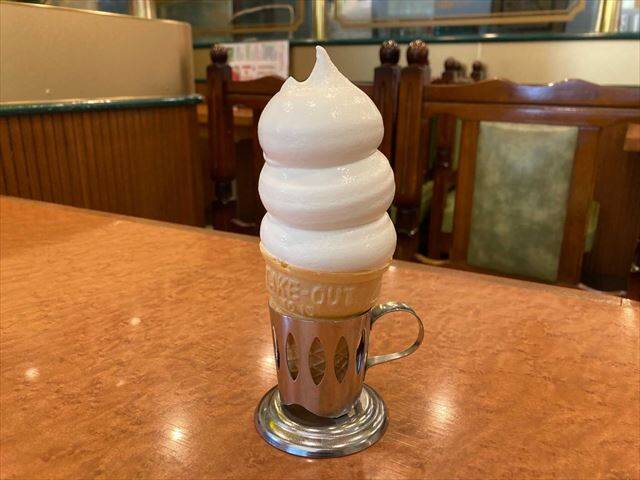 お待ちかねのソフトクリームが運ばれてきました。ちょっと太めのまきまきが、とてもかわいらしいです。ソフトクリームが入った台も、なんだかレトロでいい感じです。