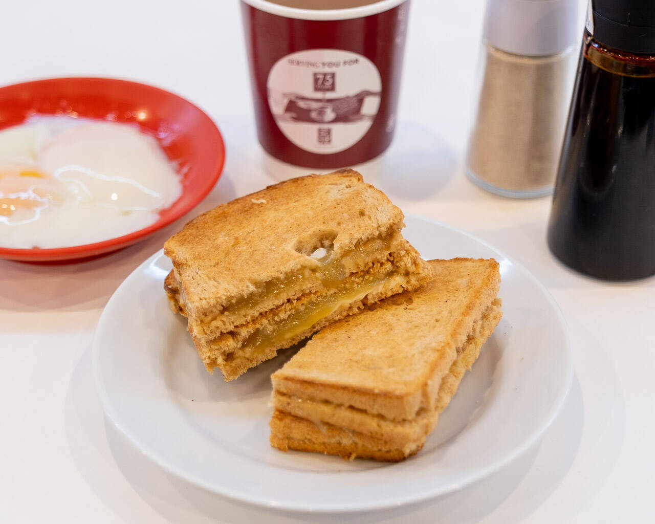 飲み物は「コピ」を選びました。コンデンスミルク入りのコーヒーです。濃厚な口当たりで、カヤトーストに負けない存在感があります。