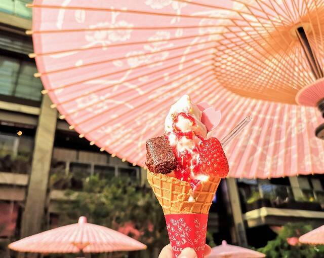 傘の淡いピンクに包まれて、ちょっと座って小休憩。お供にしたのは「ISHIYA NIHONBASHI(イシヤ 日本橋)」のテイクアウト限定「春のストロベリーサンデー」(680円・税込)。