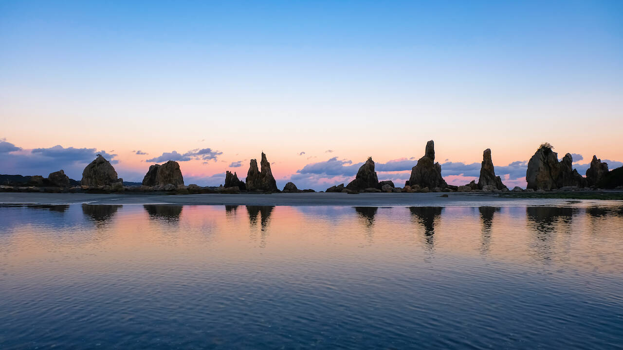 日の出の時間帯が絶好のシャッターチャンス。朝日を浴びて海からそそり立つ橋杭岩は、神秘的な美しさをまといます。