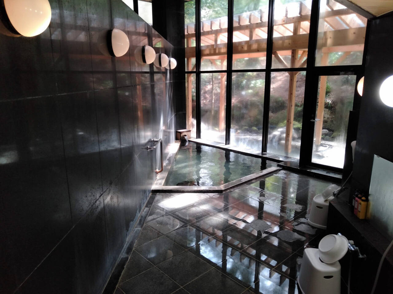 黒御影石と天井高までガラス張りになり、太陽の光が陰影をつくりだすなんともいえない素敵な内湯。