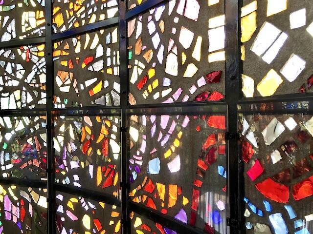 分厚いガラスを槌で手割した破片で造られたというステンドグラス。外光を受けてエレガントに煌めく姿は心が揺さぶられる美しさです。