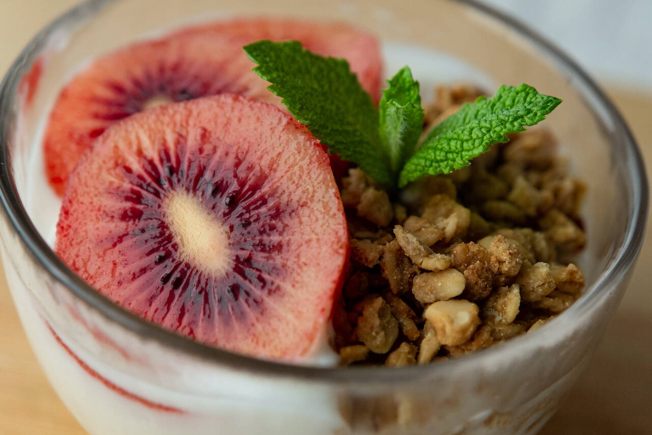 キウイフルーツの本場・ニュージーランドでは、キウイフルーツをそのまま食べるだけでなく、ヨーグルトボウルやサラダに添えて食べるのが一般的。ということで、筆者もレッドキウイとグラノーラでヨーグルトボウルにトライ!