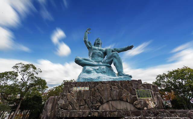 1945年8月9日に長崎に原子爆弾が落とされ、原爆が落下した場所を中心に平和公園が建設されました。公園には高さ9.7メートル、重さ30トンの青銅製の「平和祈念像」が鎮座しています。この像は、長崎出身の彫刻家・北村西望氏によるもの。神の愛と仏の慈悲を象徴とし、天を指した右手は“原爆の脅威”を、水平に伸ばした左手は“平和”を、軽く閉じた瞼は“原爆犠牲者の冥福を祈る”という想いが込められています。