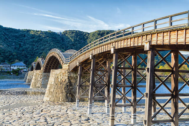 錦帯橋は岩国市を流れる錦川に架かる木造五連のアーチ橋で、その歴史は古く、1673年までにさかのぼります。当時、岩国藩主だった吉川広嘉が現在の錦帯橋の原型となる木造の橋を建造。しかし、洪水の被害に遭い、すぐに流されてしまいます。そこでより強度を高めるため、構造や技法に改良を重ね、翌年、再建を果たします。そのとき完成した橋は、1950年までの276年間保たれ、現代の橋梁工学からみても非のうちどころがないといわれています。