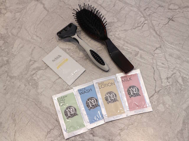 また、同じく2階には、アメニティコーナーがあるので立ち寄るのをお忘れなく。基礎化粧品セット、ヘアブラシ、ナイトウェア、レザーが置いてあります。ナイトウェアはS、M、Lと3サイズあるので選べるのもうれしいですよね。