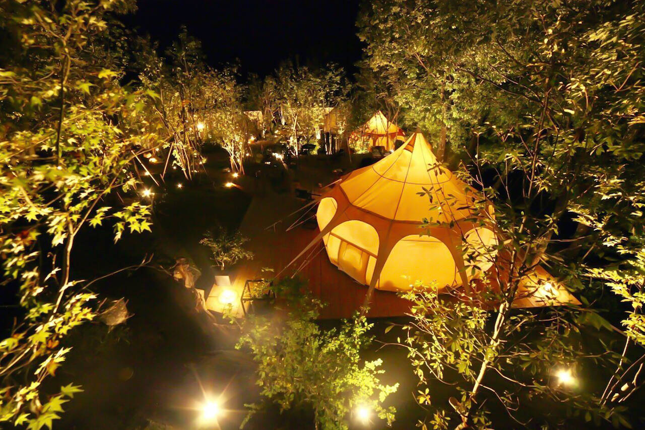湯布院と別府の中間に位置し、湯布院の中心部からは車で約30分。敷地に入った瞬間からまるでファンタジーのような別世界が広がります。施設内では、温泉をはじめ、こだわりのテント室内やアウトドア体験など充実した設備が整っており、アウトドアが初めてでも安心して過ごすことができます。
