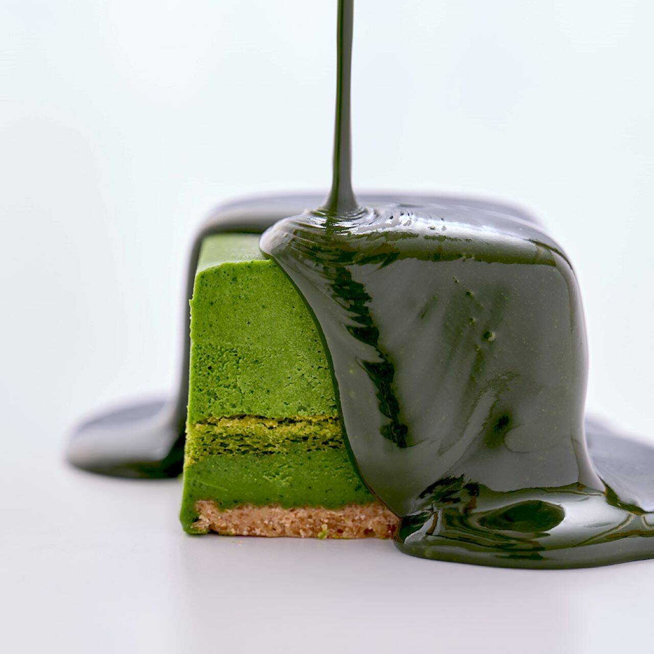 なめらかな口当たりの抹茶ムースの下には、まろやかなガナッシュ、そして抹茶ビスキュイがリッチな味わいを添えています。サクサクとした食感のフィユティーヌがアクセントに。抹茶の香りが濃厚なショコラ・グラサージュで、全体を艶やかにコーティング。金粉があしらわれたプレミアムな一品です。