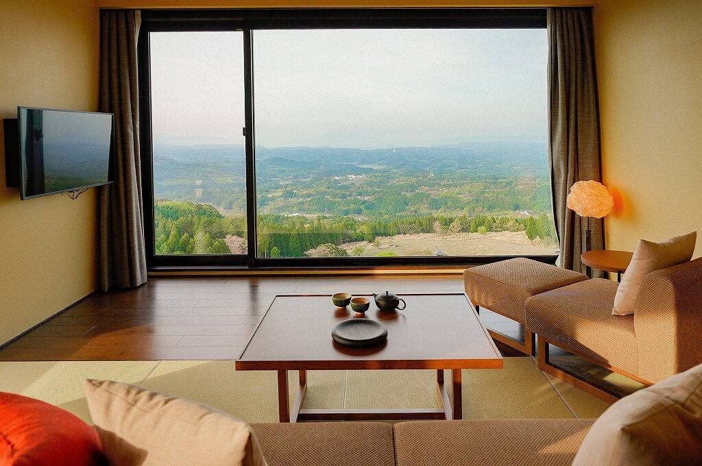 「界 霧島」は、日本初の国立公園として知られる「霧島錦江湾国立公園」の中にあります。晴れていれば、全49室の客室から霧島高原や錦江湾、もくもくと煙を上げる桜島を見渡すことができる全室“桜島ビュー”の大パノラマは想像以上。大きな窓から見る景色は、まるで絵画のような美しさです。