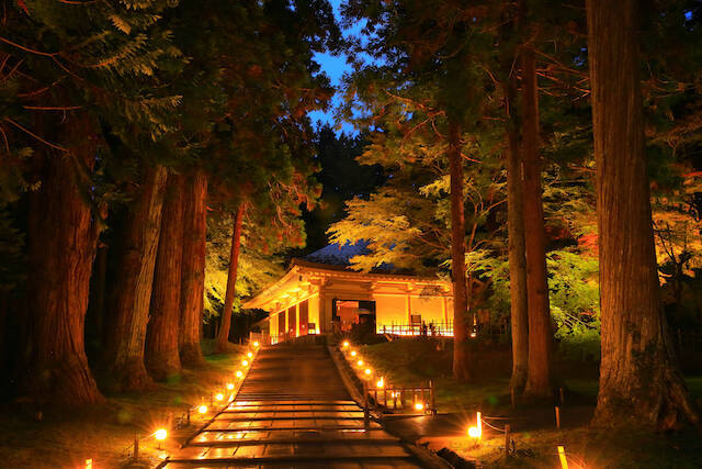 中尊寺はそんな平泉を代表する歴史的建造物で、1100年代に奥州藤原氏によって建てられた天台宗の寺院です。中でも金色堂は、本尊を安置する内陣の内外に金箔を施し、まさに豪華絢爛。螺鈿細工や象牙、宝石類などの飾りも配しており、こうした意匠は極楽浄土を表すためのものであり、貴重な文化物として国宝に指定されています。