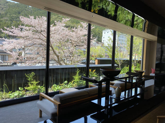 こうして到着した「界 長門」。敷地内に入り、小さく歓声をあげてしまいました。大きな窓からは温泉街と音信川の景色が飛び込んできます。音信川は地元の子どもたちの格好の遊び場で、夏には泳ぐ子どももいるそう。近所のおみやげ物屋さんでは、水着のレンタルもしているそうですよ。夏に訪れるなら、ぜひ水着を持参してみてはいかがでしょうか?
