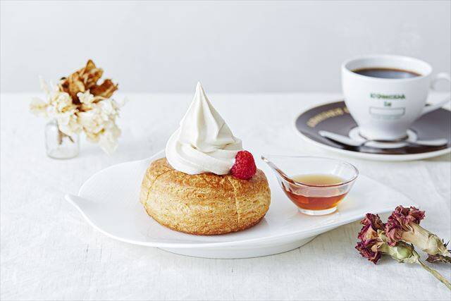 長年のコメダのパンづくりのノウハウを活かして、植物性の原料でおいしいデニッシュパンができるよう試行錯誤を重ね、およそ一年をかけて開発したのだとか。メープルシロップやソフトクリームがしっくり染み込むよう、従来のシロノワール同様、自社パン工場の職人がデニッシュ生地を手作業で折りたたみ64層に仕上げています。丁寧に焼き上げたデニッシュパンの上には、豆乳で作ったソフトクリーム、さらに上からサトウカエデの樹液100%のメープルシロップ、ラズベリーが添えられています。