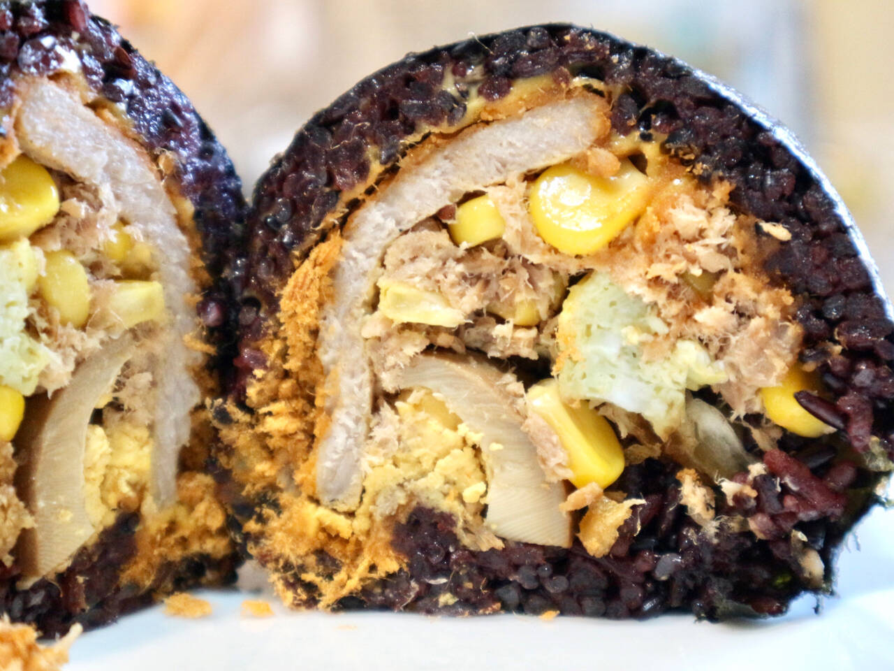中には基本の具である肉鬆(肉でんぶ)、干し大根、酸菜(からし菜の漬物)、油條(揚げパン)、煮卵に加え、玉子焼き、豚肉、ツナ、チーズ、コーンが入っていました。おにぎりのまわりには海苔も巻かれています。ものすごい具だくさん!