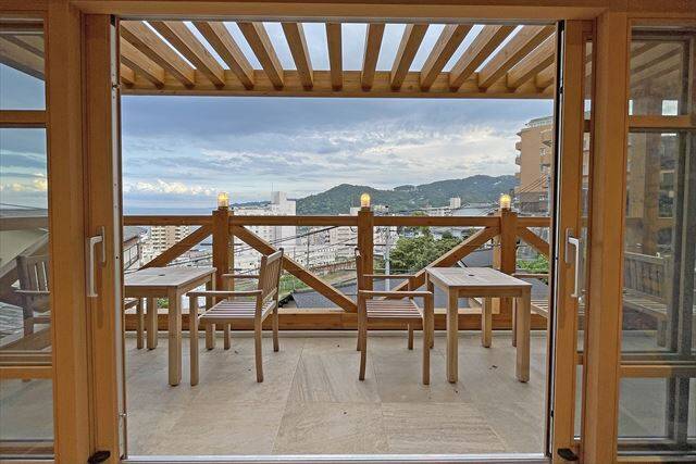 屋上テラス席からは市街と相模湾を一望できる、開放感あふれるロケーション。
