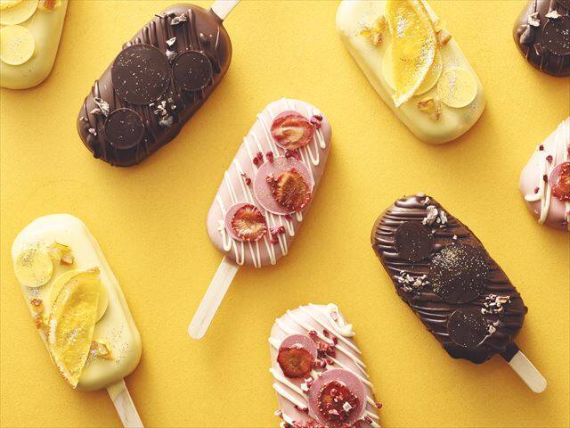 まるでアイスキャンディーのようなカラフルで心躍るキュートなスイーツ「ストリングス・ロリポップ」。フィナンシェをチョコレートでコーティングした焼き菓子は、フルーツの甘酸っぱさがアクセントの“ベリー&ルビーチョコレート”と“オレンジパッション”、組み合わせにこだわった“ダークチョコレート”の3種。