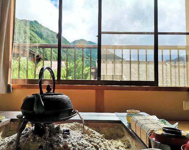 角部屋の広々とした和室で、窓からは山々とかりがね橋を望め、川のせせらぎが心地よいです。日本茶とお茶請けの「かき餅・きりこ」で女将さんがおもてなし。契約農家さんの減農薬米と名水で作ったお菓子で、軽くてサクサクでお米の甘みが豊かで、宿泊客にも大人気!