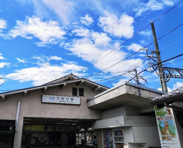 奈良駅から近鉄電車を乗り継ぐこと約2時間。到着した「下市口駅」の目の前には、天川村行きのバス停が待っています。線路を渡るとコンビニもありました。