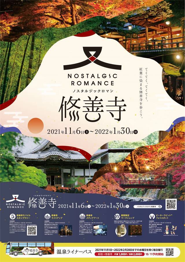 2021年11月1日から来年2月28日までの期間限定で、お一人様旅行代金往路1,000円、往復2,000円で新宿から修善寺温泉までの直行バス「温泉ライナー修善寺」の販売がスタート。