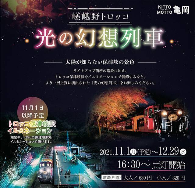 嵯峨野トロッコ列車のライトアップで幻想的な風景を