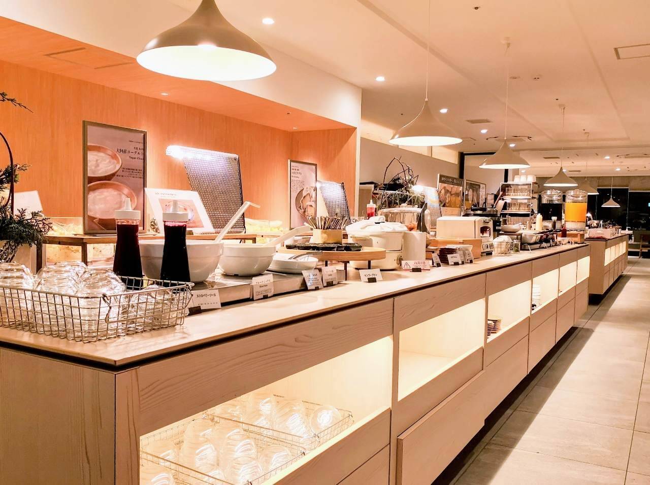 朝食はビュッフェ形式。長い台には熊本の食材や郷土料理を中心に和洋のメニューがずらり! 手袋とマスクを着用して料理を取り分けます。お皿の形もいろいろ用意されていて、座席は壁沿いにゆったり間隔。