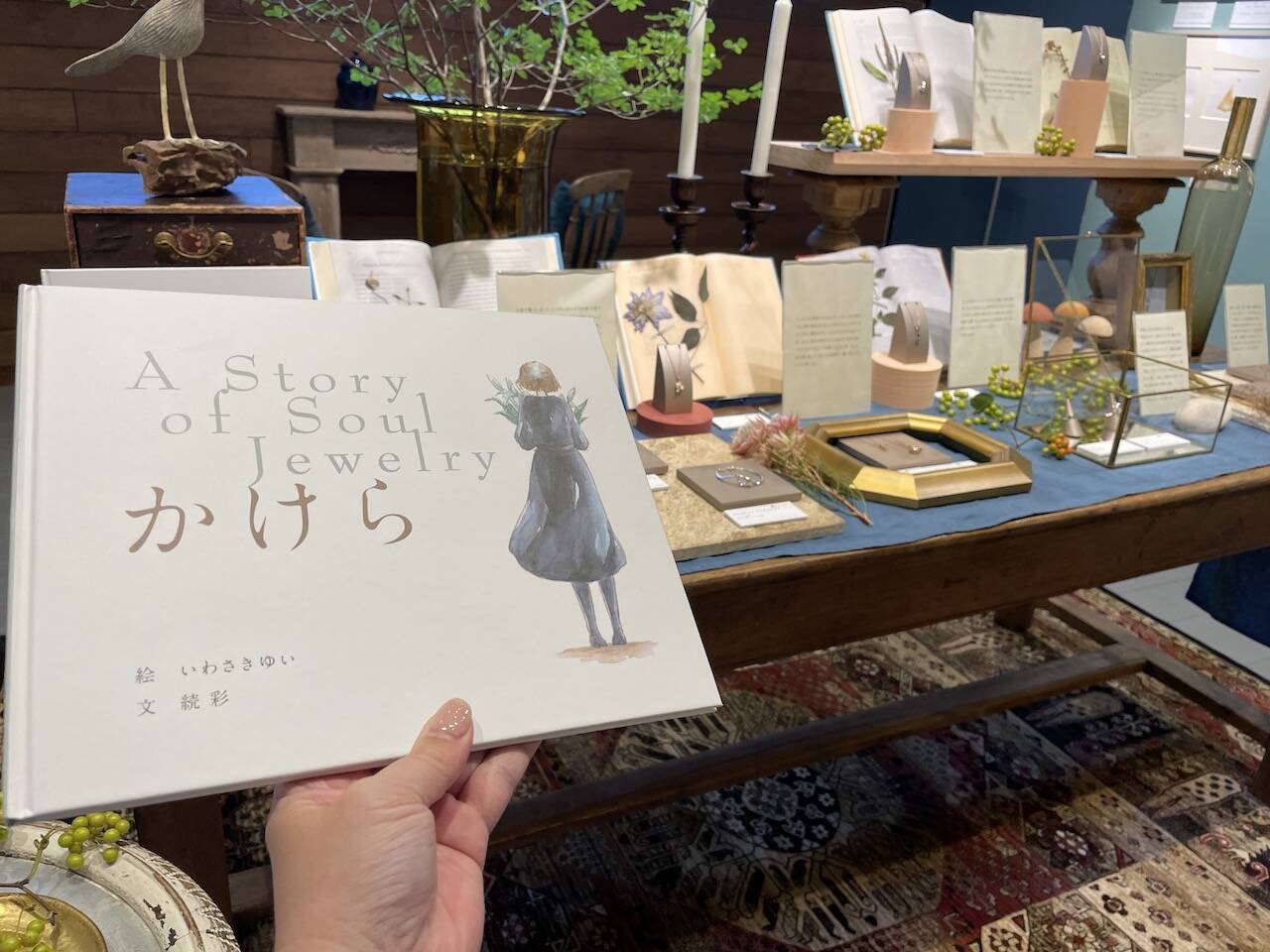 同展では、大切な人を失った主人公が、悲しみを受け入れ乗り越えてゆく姿を描く、大人の絵本「かけら」の世界観が表現されています。また、絵本にも登場するジュエリーを、大切な方を亡くされたご遺族の体験談とともに展示。
