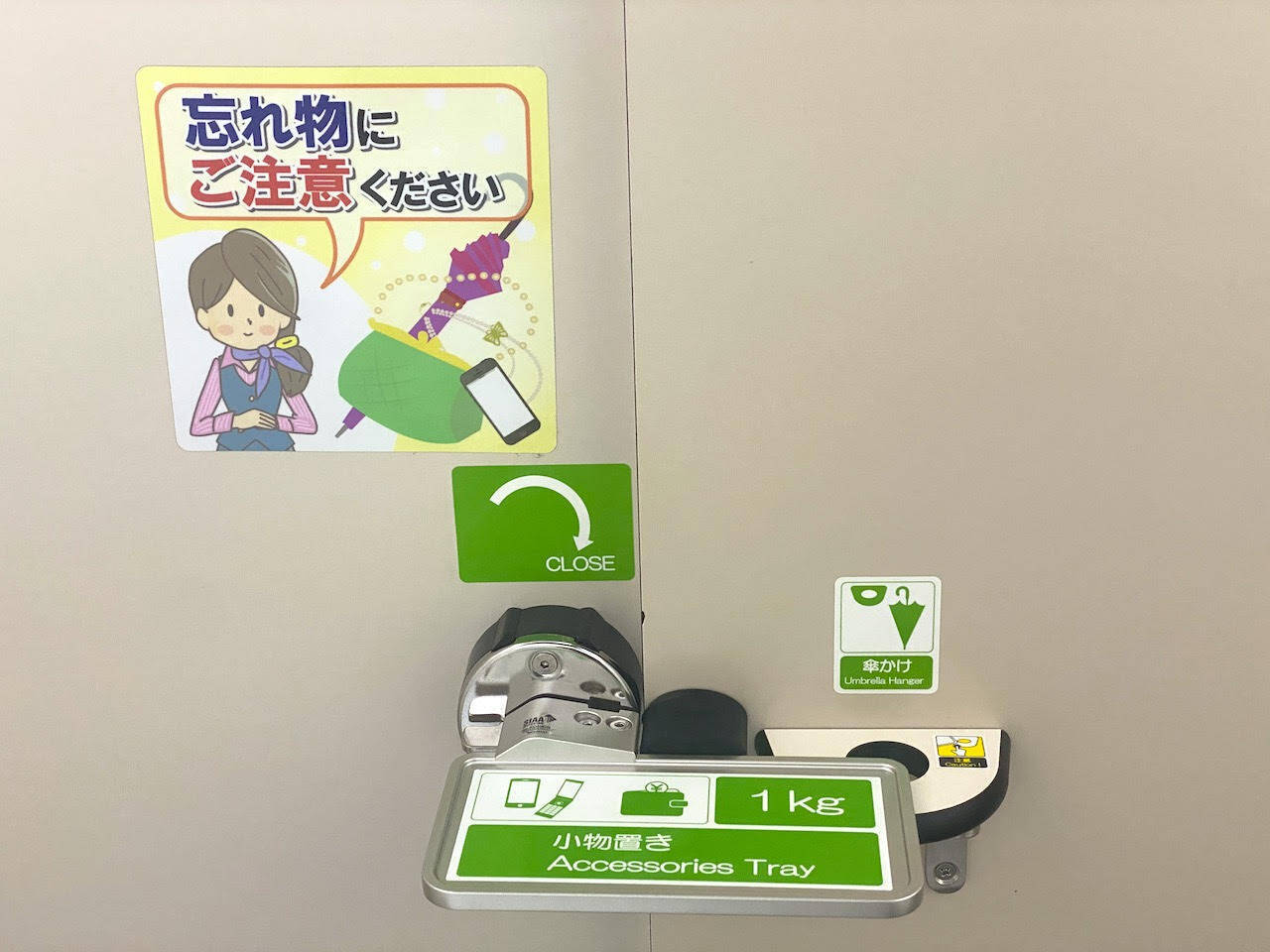 こちらは関越の塩沢石打SAのトイレで、思わず「天才か!」と声に出して感動してしまった忘れ物防止トレイ。携帯やスマホ、財布などを載せられるトレイが鍵になっているんです。おまけに傘かけまで!
