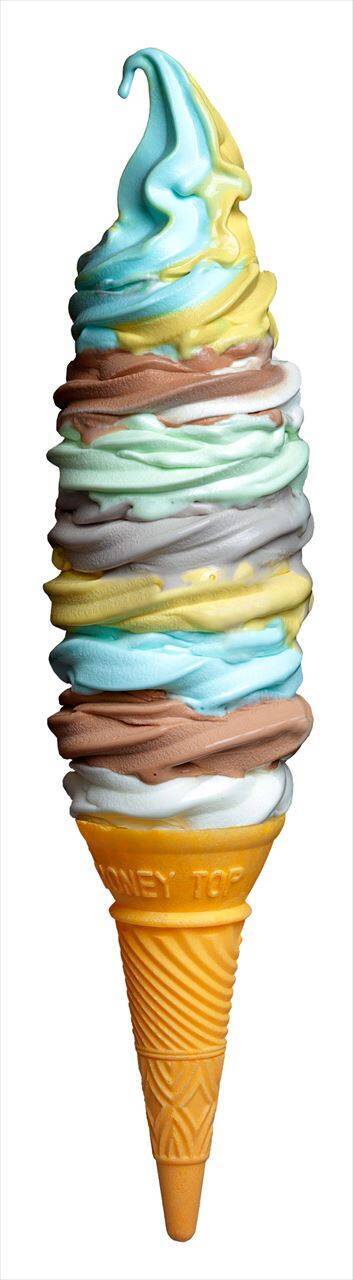 1966年創業の老舗店が作る、約40cmの巨大8段ソフト。下からバニラ・チョコ・ラムネ・焼き芋・ごま・ピスタチオ・バニラ×チョコ・焼き芋×ラムネ。