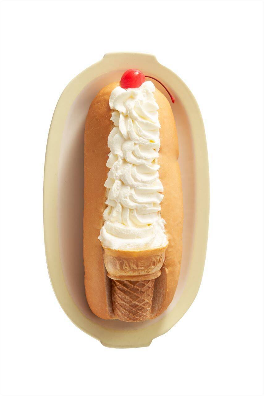 ソフトクリームを、甘さ控えめの生クリームで再現した限定パン。8段巻きの生クリームに注目。