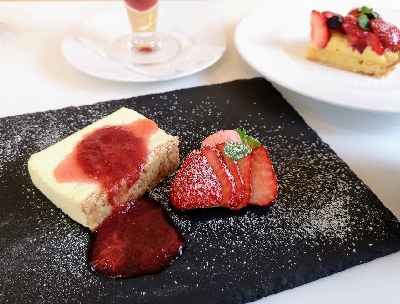 晴苺のジャム、ゼリー、いちごのレアチーズ、スポンジ、生クリーム、 いちごのアイスクリームと重なっています。甘酸っぱくて上品な味わいの晴苺スイーツのオンパレード。特に、いちごのレアチーズでは、チーズに引けを取らない晴苺の濃厚さに驚きました。晴苺の果肉のフレッシュ感とスイーツ感を存分に味わい尽くせます。