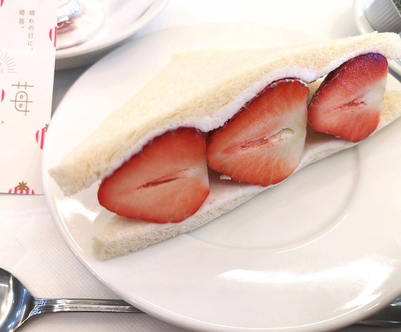 1952年創業の老舗のフルーツサンドは、断面も美しい……。大粒の晴苺を半分にカットし、控えめの量のバタークリームを塗った薄めのパン生地で挟んでいます。晴苺は一口ごとに果汁があふれるほどジューシーで、甘みと香りの存在感が抜群。