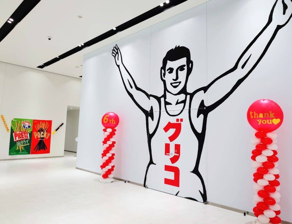施設に入ると、栄養菓子「グリコ」のロゴマークのゴールインマークがドーンとお出迎え。他にも、ポッキーやプリッツの巨大オブジェの撮影スポットもいっぱいで、テンションもアップします!
