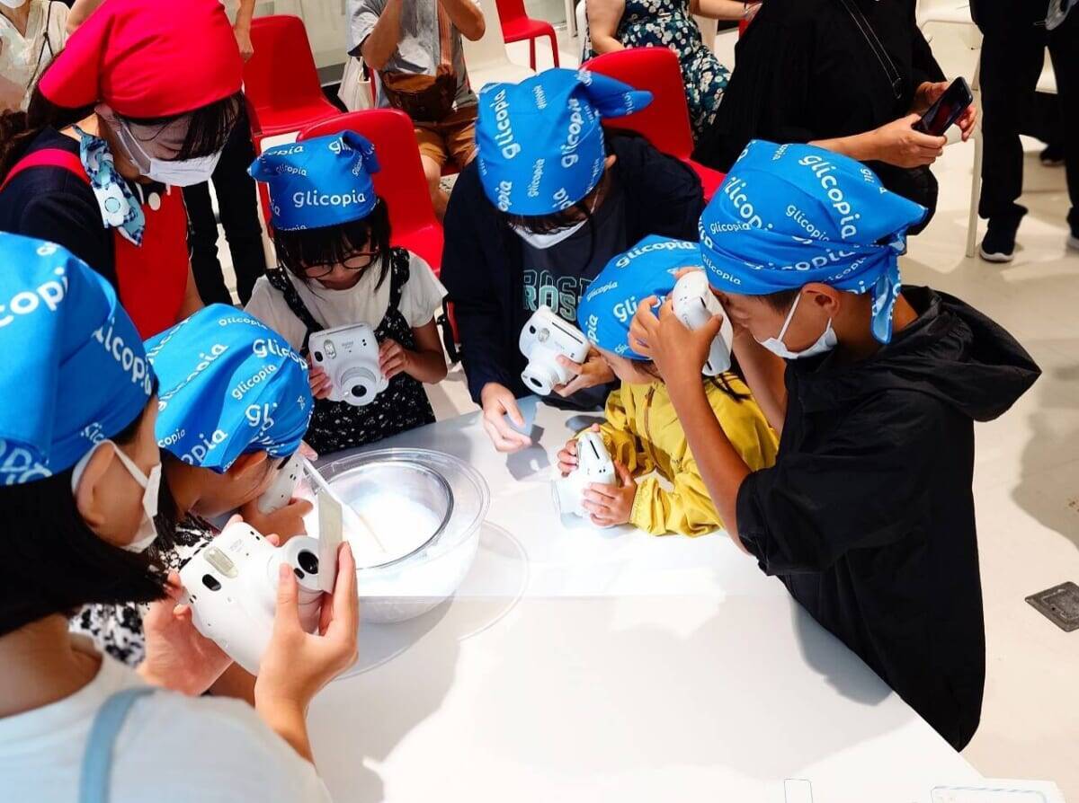 子どもたちは用意されたバンダナを頭に巻いて、ノートとチェキを携えて、「パピコ」のなめらか食感についての謎や、塩や砂糖を加えることでなぜ氷が冷たくなるのかを実験しながら学んでいました。