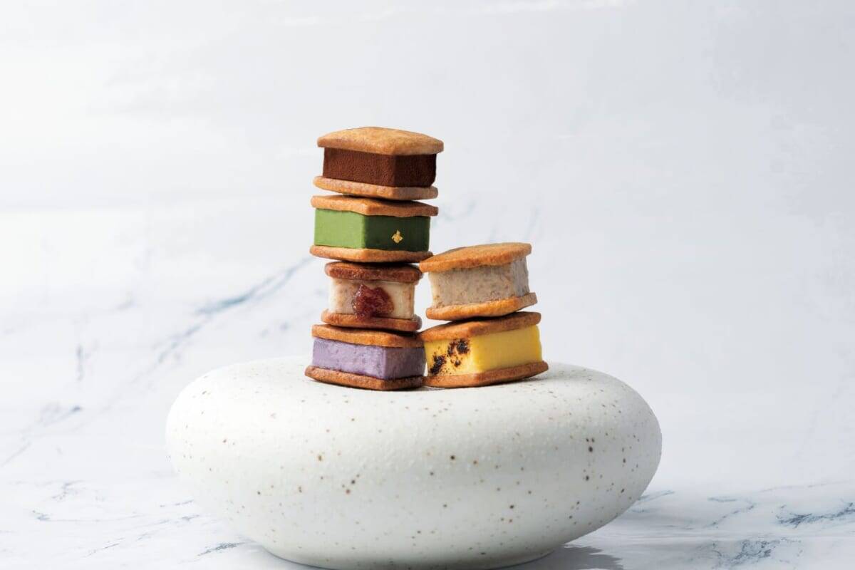 渋皮を残した和栗の旨味に加え、ブランデーの風味、飾り付けのピスタチオのコクが調和したバターサンド。お酒にも合う大人の味わいを楽しんでみては。