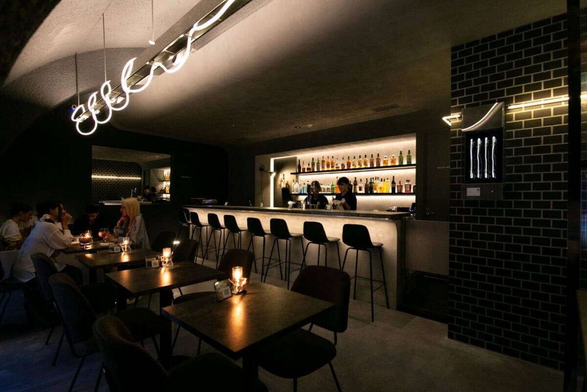 その外観を生かし、アーチ状の空間に柔らかな屋根をかけ、その下にバーカウンターを配置。全体はさまざまな黒を基調としていますが、暗い中にも表情や動きが感じられるデザインとなっています。