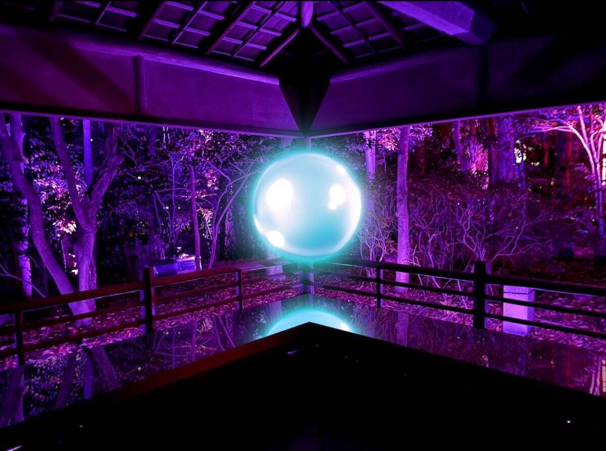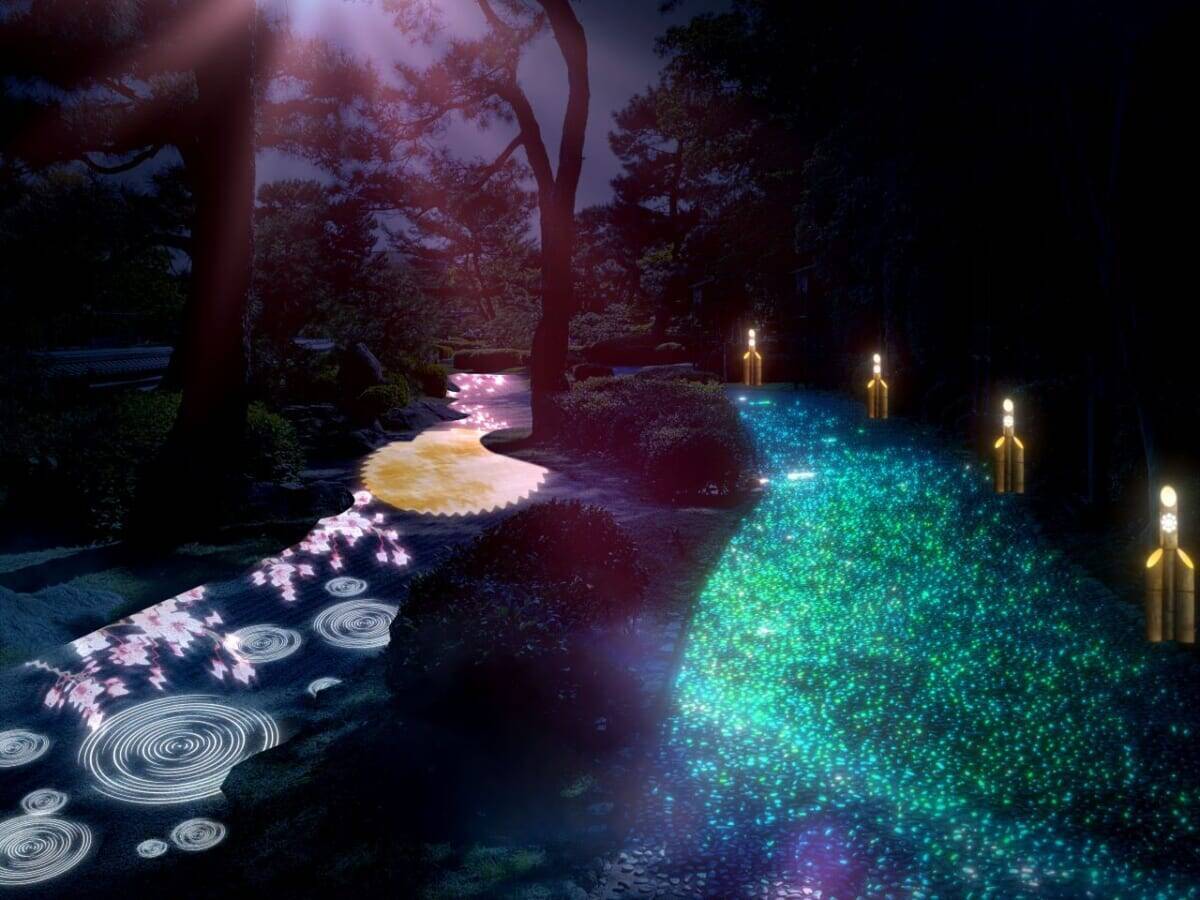 「宙(SORA)」は、日本庭園のさまざまな造形にプロジェクションマッピングを投影し、ゲストがその光を道しるべに回遊するアートイベントです。
