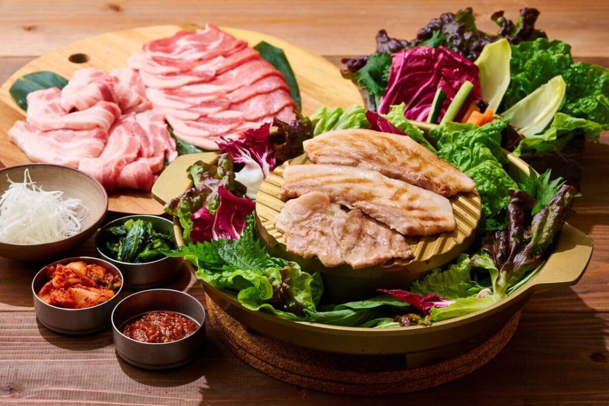 北海道産の豚肉の2部位を使った、サムギョプサル食べ比べコースです。サンチュやほうれん草ナムル、キムチなどの野菜もたっぷり楽しめますよ。