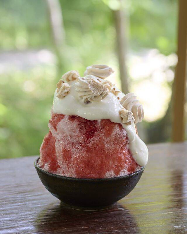 中には丹波大納言小豆餡とバニラアイスが入っており、白玉との組み合わせも絶妙。暑い季節にすっきりと味わえる大人のかき氷です。