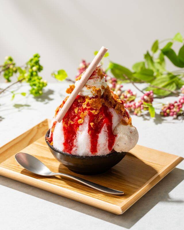 華やかな丹波産いちごの風味を楽しめるかき氷。ミルクのエスプーマがやさしく広がり、苺ジャムとバニラアイスが甘みの層を加えます。