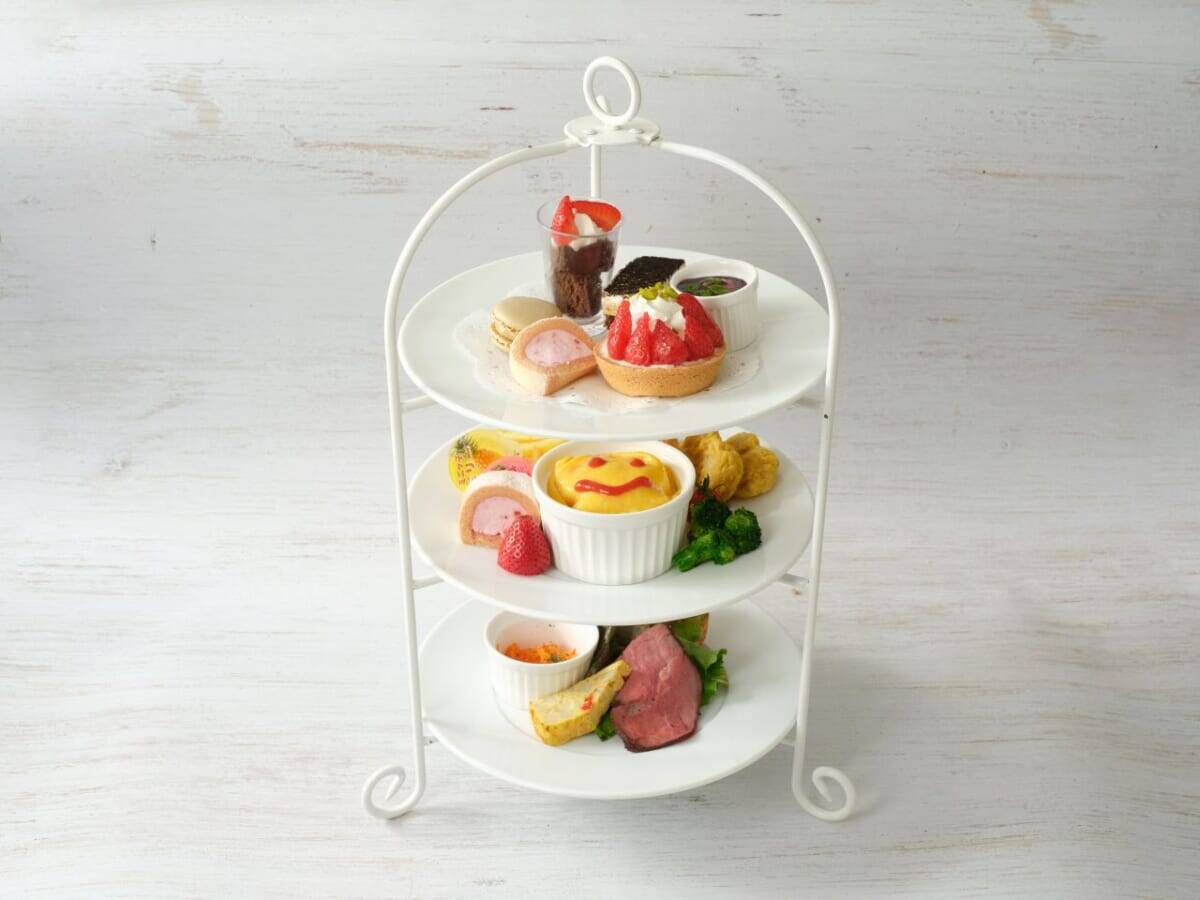 3段スタンドのうち1段がお子様専用プレートになった、新スタイルのアフタヌーンティーセットです。オムライスやチキンナゲット、エビフライなど全6種のお子様メニューが可愛らしく盛り付けられています。